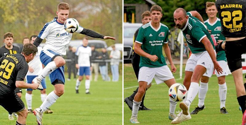 Das Derby mit dem Lauber SV verspricht ein erster Härtetest für den SC D.L.P. zu werden. Im linken Bild D.L.P.-Stürmer Maximilian Beck, im rechten Bild links Youngster Benedikt Seefried, am Ball Spielertrainer Linn Hertle. Foto: Szilvia Izsó/Klaus Jais